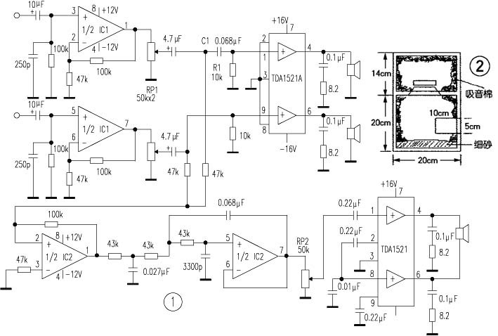 如图1,左右声道由一只双运放作线路放大。为了让两只卫星箱在自己的频带内更好地工作,在左右声道功放之前设置了一阶高通滤波,截止频率f=1/6.28RICI。按图示值,高通截止频率约为200Hz。由一只TDA1521A作6W功率放大。低频通道由一只双运放组成,左右声道经1/2IC2做成的加法器复合后送入以1/2IC2为核心的巴特沃兹三阶低通滤波器,低频截止频率设在200Hz。一只TDA1521作BTL运用来担任低频功放(约30W)。变压器功率不小于100W,双12V电压经整流滤波后得到约双16V直流供功放用,另由稳压输出供前级。考虑到制作难度和功放的散热没有做成有源箱形式,而将整个电路装在一个小巧的铁盒中。